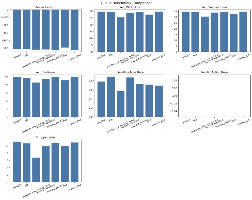 Built a custom gymnasium environment for a job queue, using wait times and priority levels. Trained a model with PPO reinforcement learning using StableBaseline3, and a custom built PPO agent using PyTorch. Benchmarked model performance against heuristic baselines with graphical analysis in MatPlotLib.