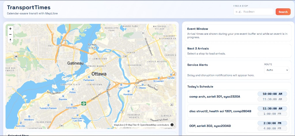 Developed a web application to view public transportation times and google calendar events. Synced backend with Google Cloud Platform, public transportation, and map tiling API’s. Allowed users to select stations to monitor using a map interface with MapLibre.